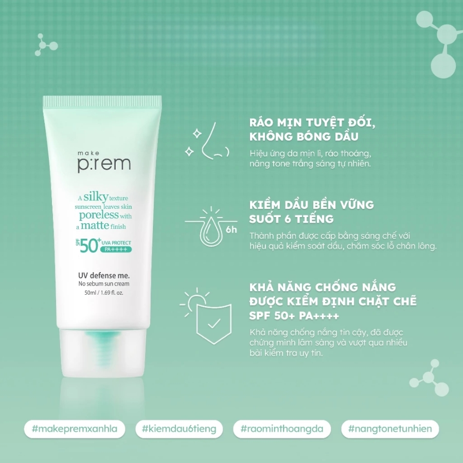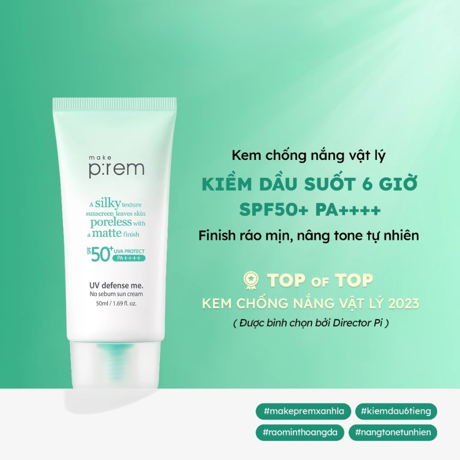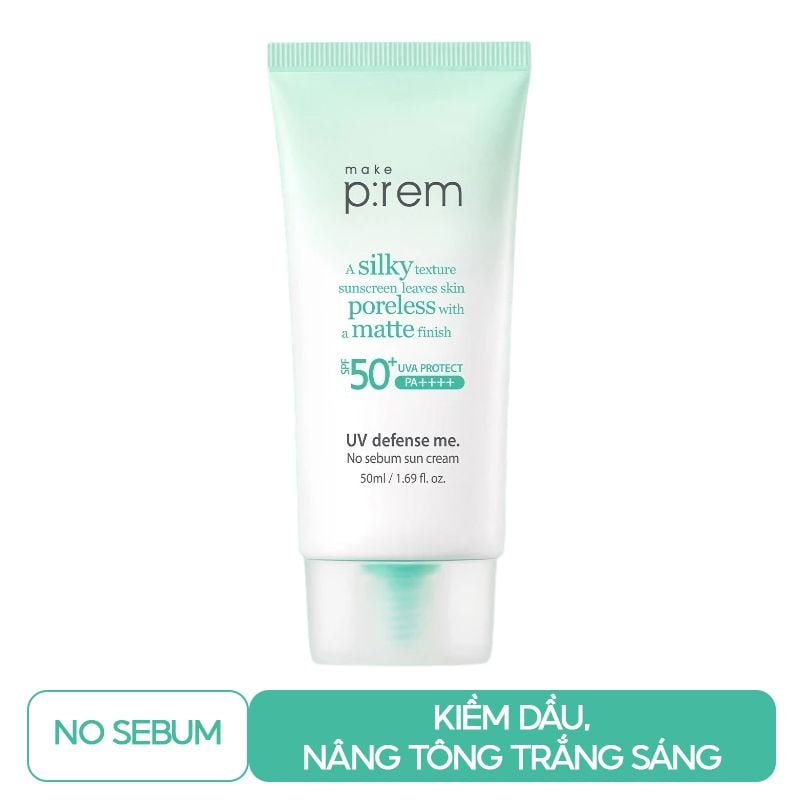 Kem Chống Nắng Vật Lý Kiềm Dầu Make P:rem Uv Defense Me No Sebum Sun Cream 50ml là sản phẩm chống nắng đến từ thương hiệu Make P:rem Hàn Quốc. Với khả năng bảo vệ da khỏi tia cực tím đã được kiểm nghiệm cùng các thành phần được cấp bằng sáng chế giúp kiểm soát bã nhờn hiệu quả, cho làn da mịn màng không bóng nhờn.