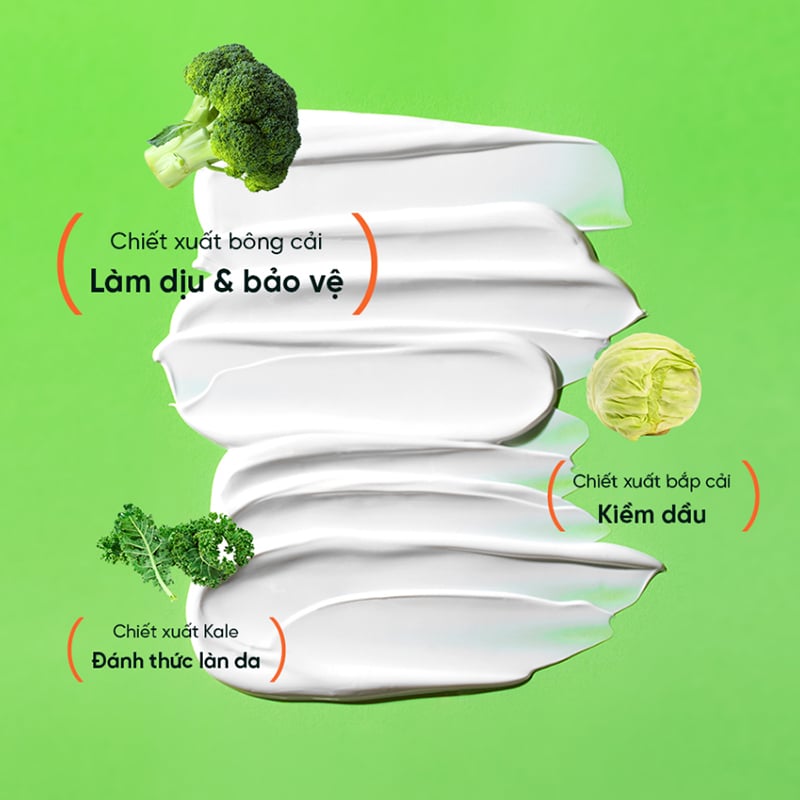 Chiết xuất từ bông cải xanh, cải bắp, cải kale: Giàu chất chống oxy hóa, hỗ trợ làn da chống lại tác động từ môi trường, làm dịu và tăng cường khả năng bảo vệ cho da, kiềm dầu và đánh thức làn da cho da rạng rỡ, tươi tắn.