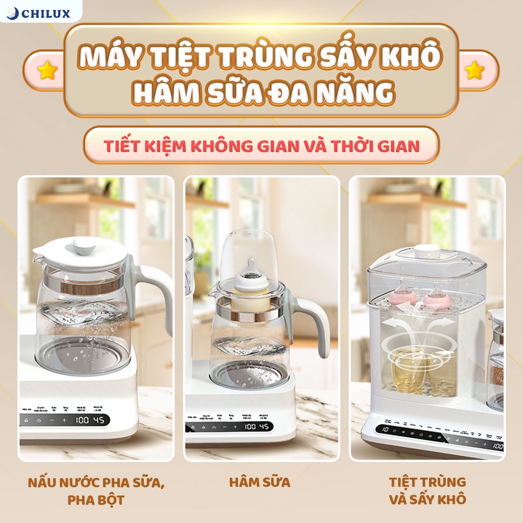 Máy tiệt trùng Chilux C1 sấy khô hâm sữa là máy Tiệt Trùng 6 trong 1 : Tiệt trùng – Ủ Sữa Chua -Sấy Khô – Đun Nước – Nấu Cháo – Hâm Đồ Ăn