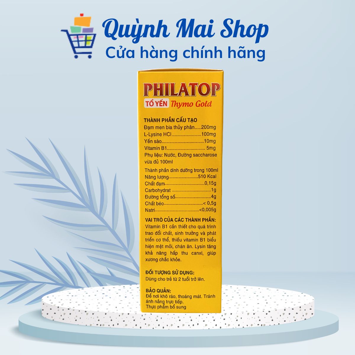 L-Lysine HCI … 100mgYến sào ... 10mgVitamin B1 … 5mgPhụ liệu: Nước, Đường saccharose vừa đủ 100mlThành phần dinh dưỡng trong 100mlNăng lượng ... 510 KcalChất đạm ... 0,15gCarbohydrat … 1gĐường tổng số ... 4gChất béo ... < 0,5gNatri … <0,005g