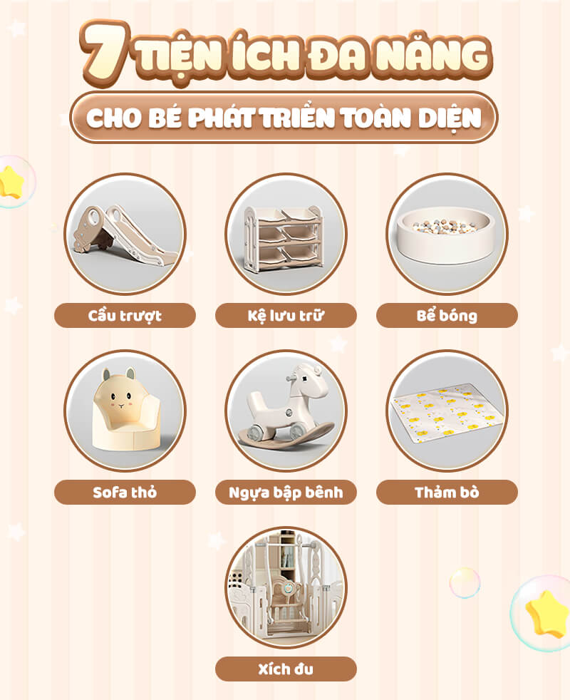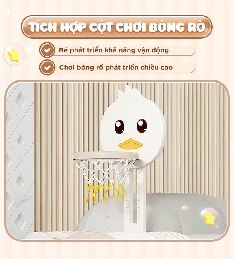 Bộ quây có đa dạng các trò chơi bao gồm cầu trượt, xích đu, bộ bóng rổ tạo điều kiện để trẻ thỏa sức khám phá và phát triển nhiều kỹ năng.