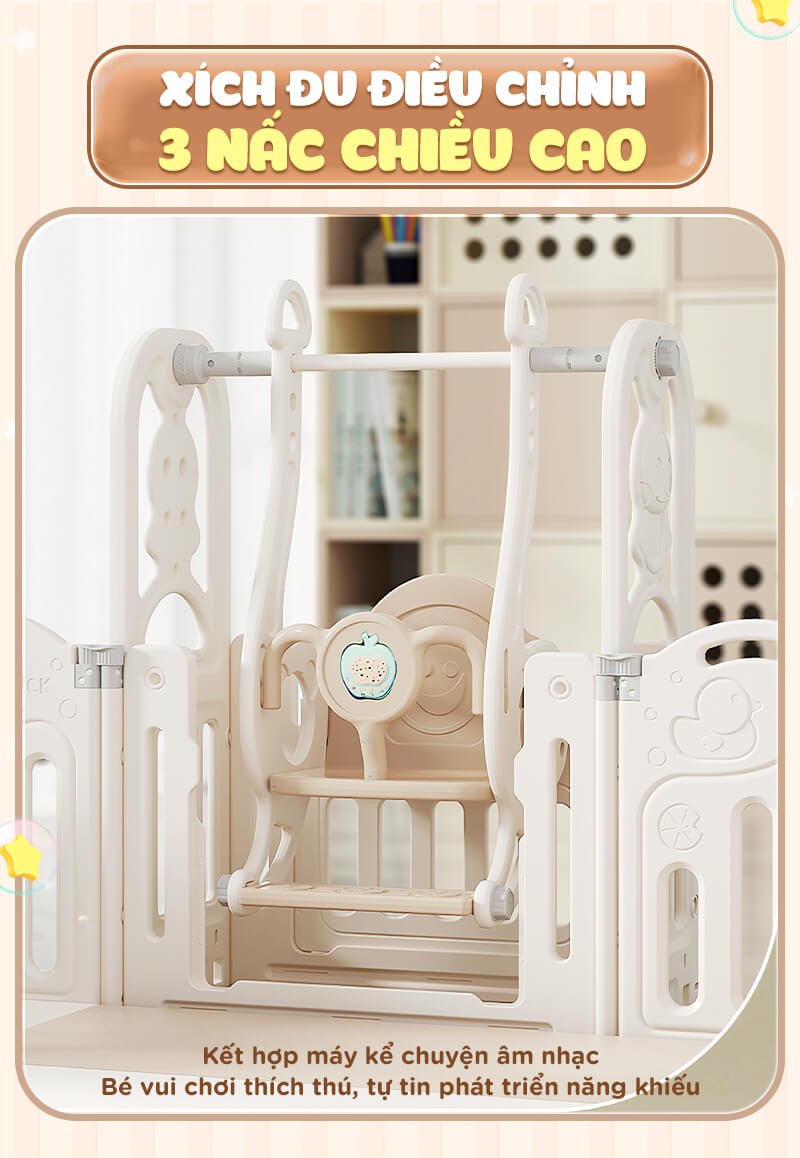 - Xích đu có phát nhạc, đai an toàn và vách ngăn bảo vệ, mang tới sự vui chơi an toàn.
