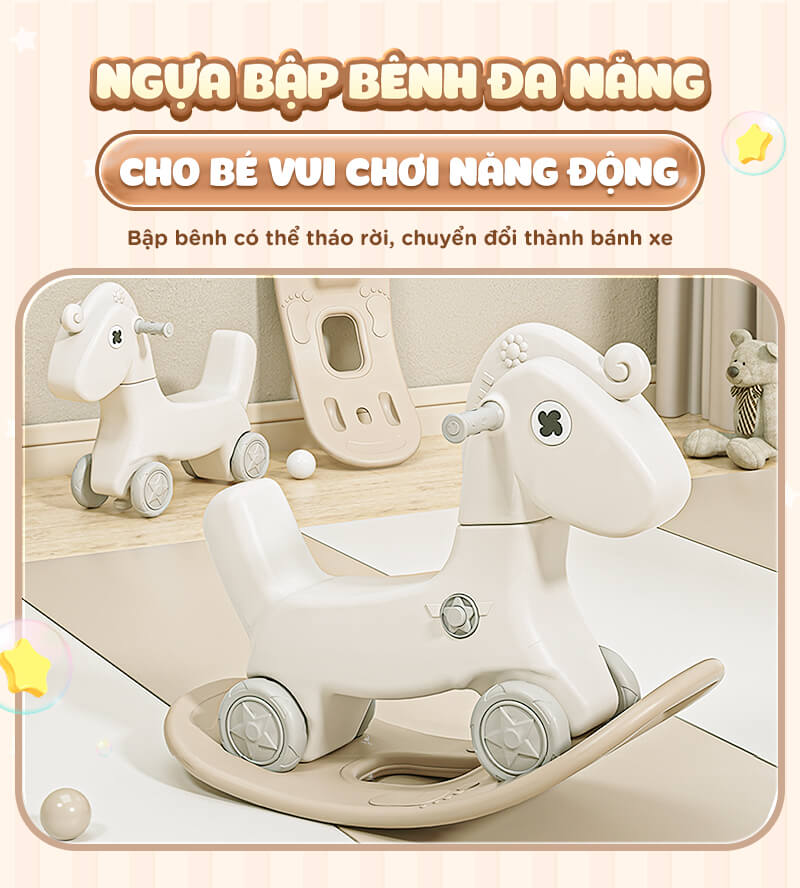 - Ngựa bập bênh có thể linh hoạt tháo rời phần đế trở thành xe đẩy 4 bánh. Bộ đôi trò chơi này giúp bé vận động nhẹ nhàng mà không gây nhàm chán khi chơi trong set quây.