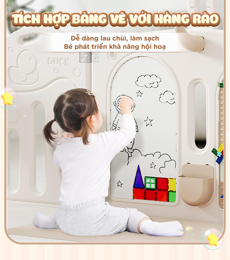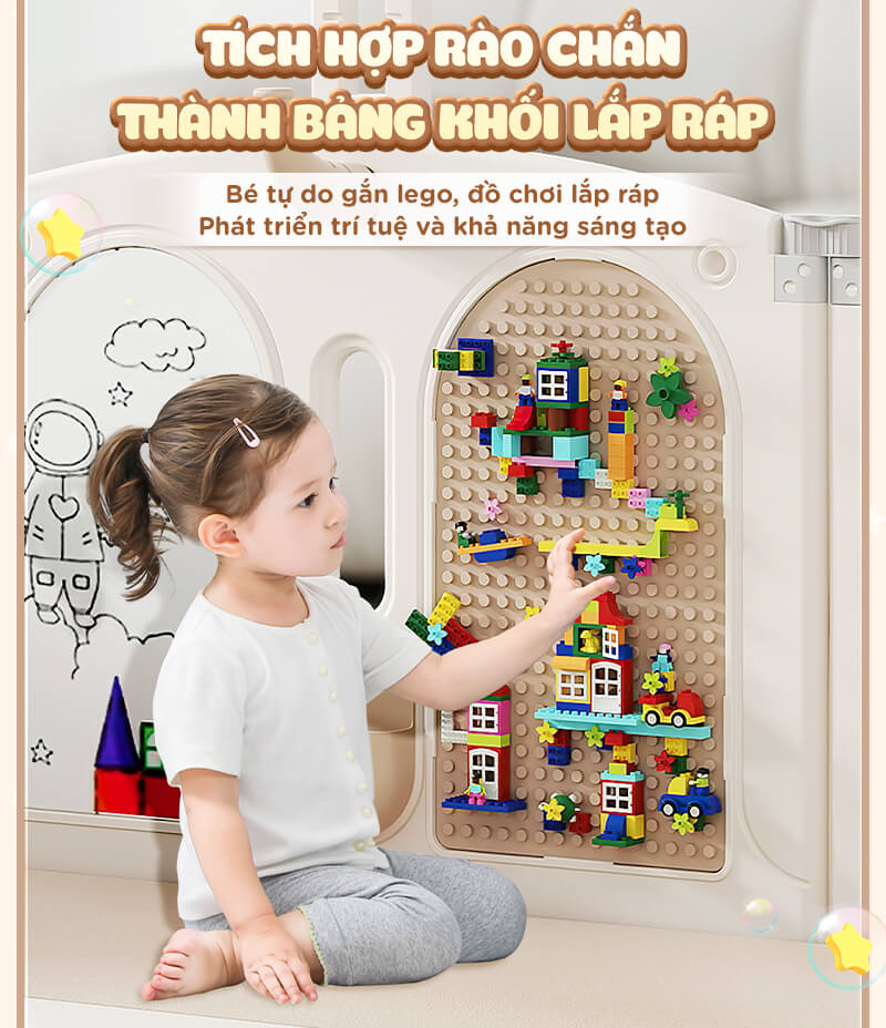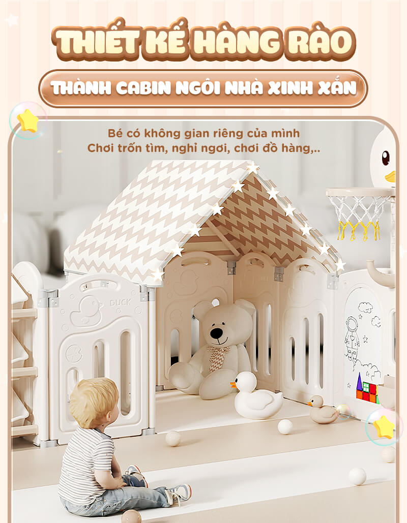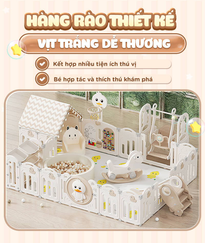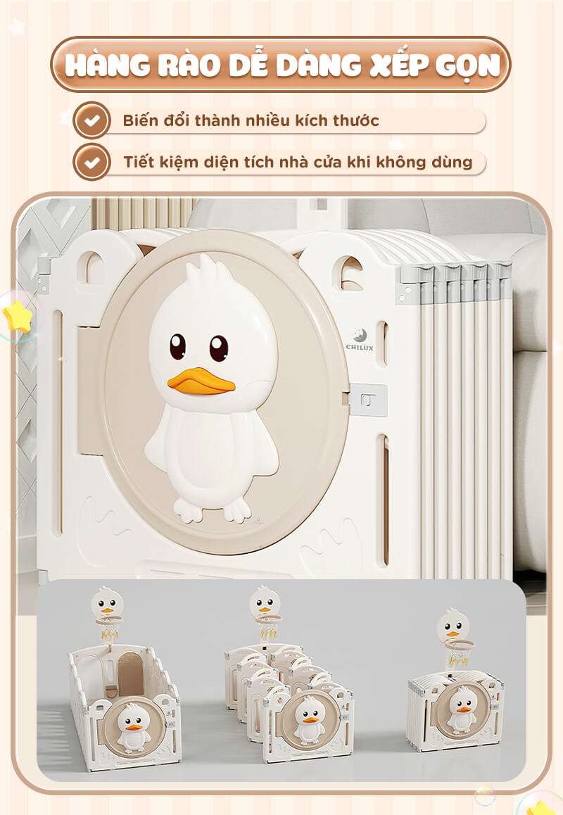 - Set quây có chức năng gấp gọn tiện lợi khi không sử dụng, khi cần dùng thì ba mẹ không cần tháo lắp phức tạp. Có thể lắp ráp linh hoạt đa dạng nhiều kiểu dáng sao cho phù hợp với không gian nhà của mỗi gia đình.