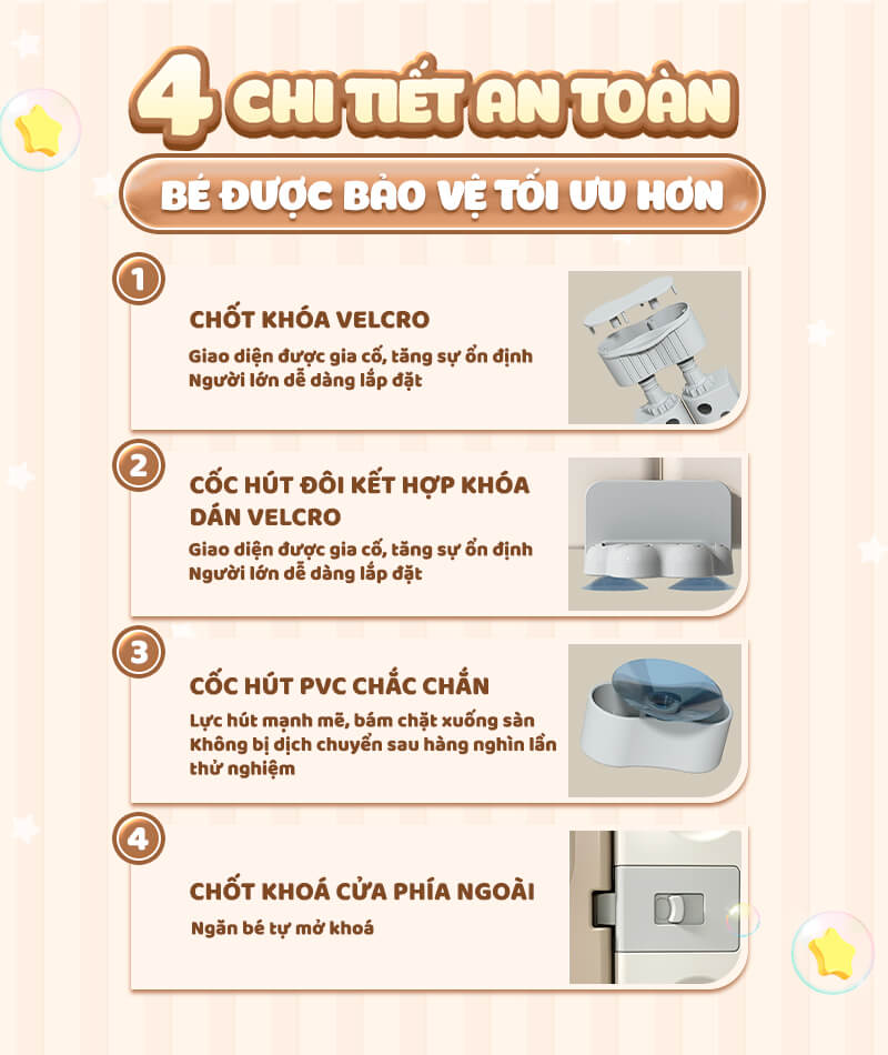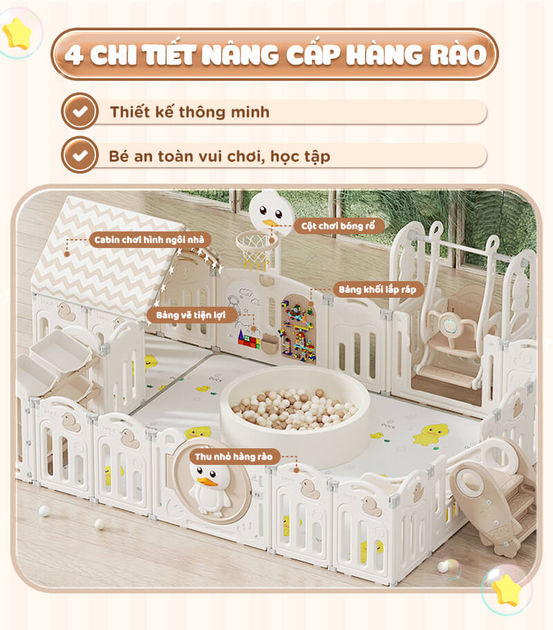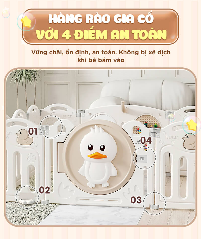 Các chi tiết nhựa được gia cố chắc chắn bằng hệ thống khóa và chốt. Các tấm quây có độ cao hợp lý kết hợp thiết kế chống trèo nhằm ngăn không cho bé leo trèo, đồng thời có cửa khóa chặt. Độ cao lên tới 63cm bảo đảm cho bé chơi đùa hay tập đi một cách an toàn nhất. Tấm quây có thiết kế thanh dọc chống trèo, tấm cửa có khoá ngoài chắc chắn để bé không tự mở cửa.