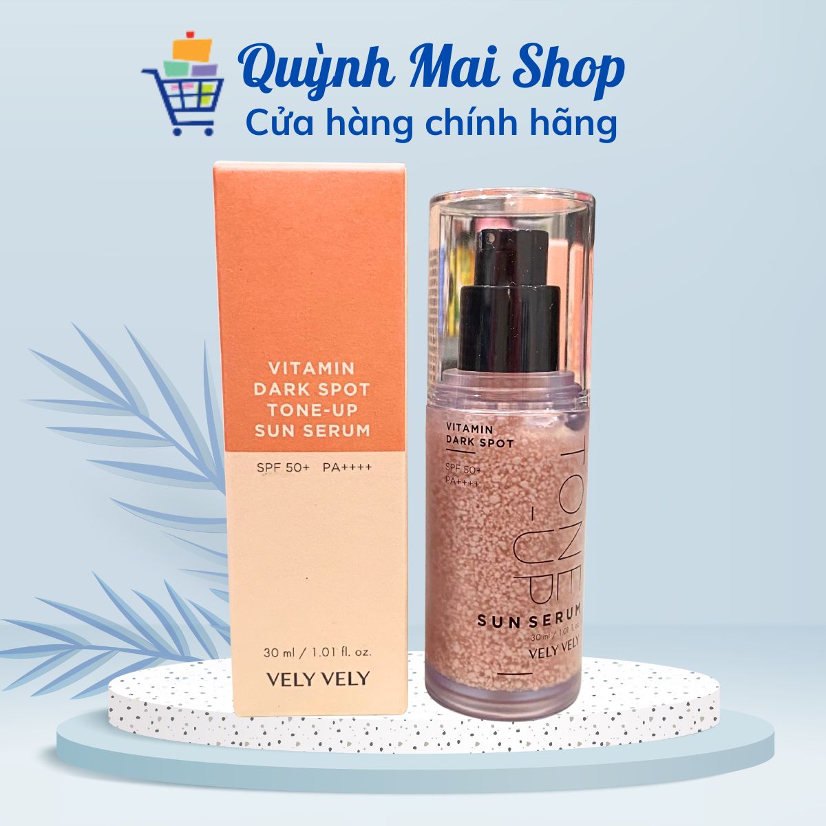 Tinh Chất Serum chống nắng nâng tone Vely Vely Vitamin Dark Spot Tone Up Sun Serum SPF50+ PA++++ là tinh chất chống nắng kết hợp dưỡng da và nâng tone tự nhiên, giúp bảo vệ tối đa trước tác hại của tia UVA, UVB đồng thời cải thiện tông màu da và làm mờ đốm nâu. Công thức chứa phức hợp Vitamin C, Niacinamide và các chiết xuất thiên nhiên giúp chống oxy hóa, ngăn ngừa sạm nám và mang lại làn da rạng rỡ, khỏe mạnh.