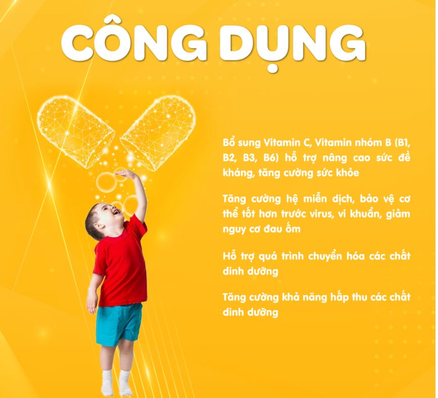 - Bổ sung Vitamin C , Vitamin nhóm B (B1,B2,B3,B6 ) hỗ trợ nâng cao sức đề kháng, tăng cường sức khỏe.