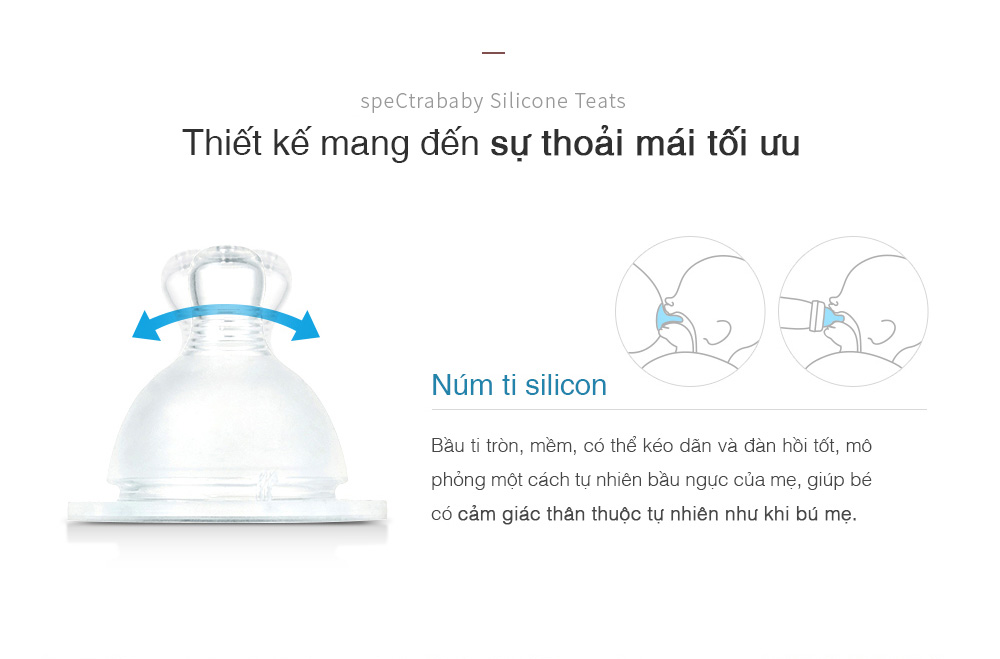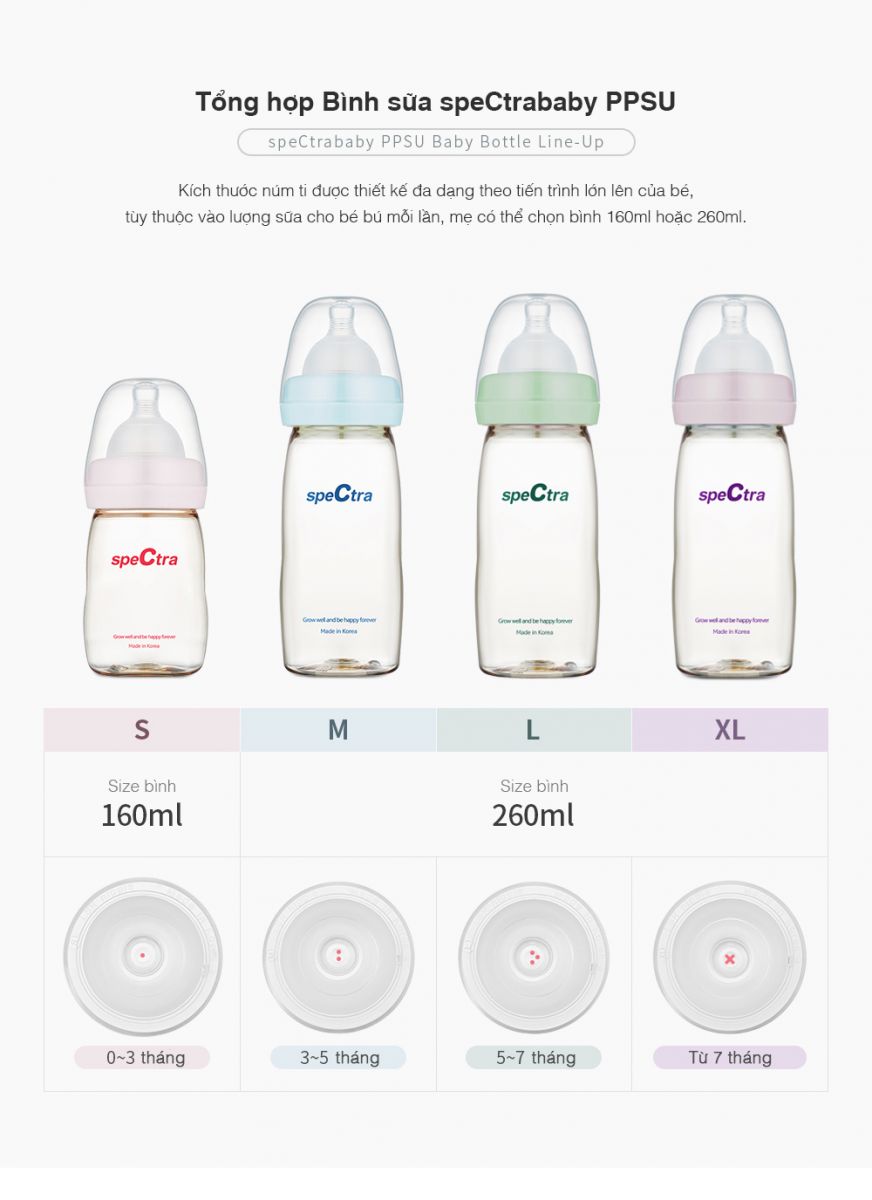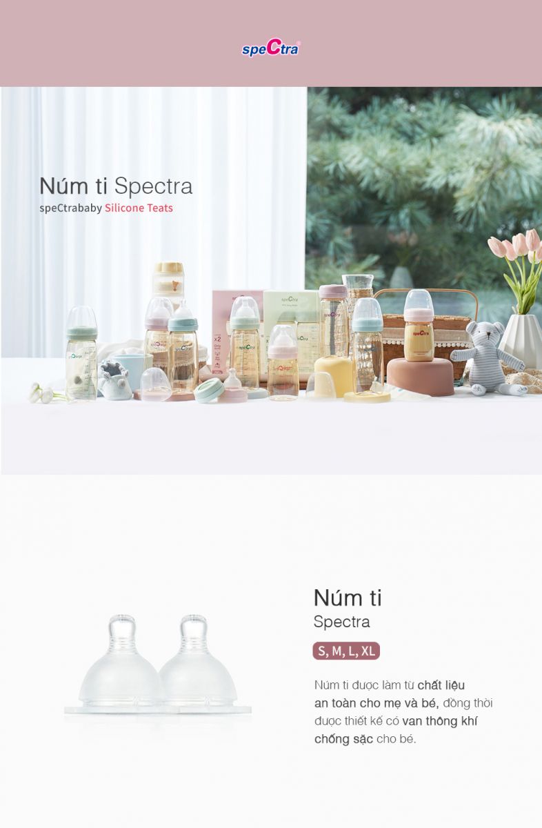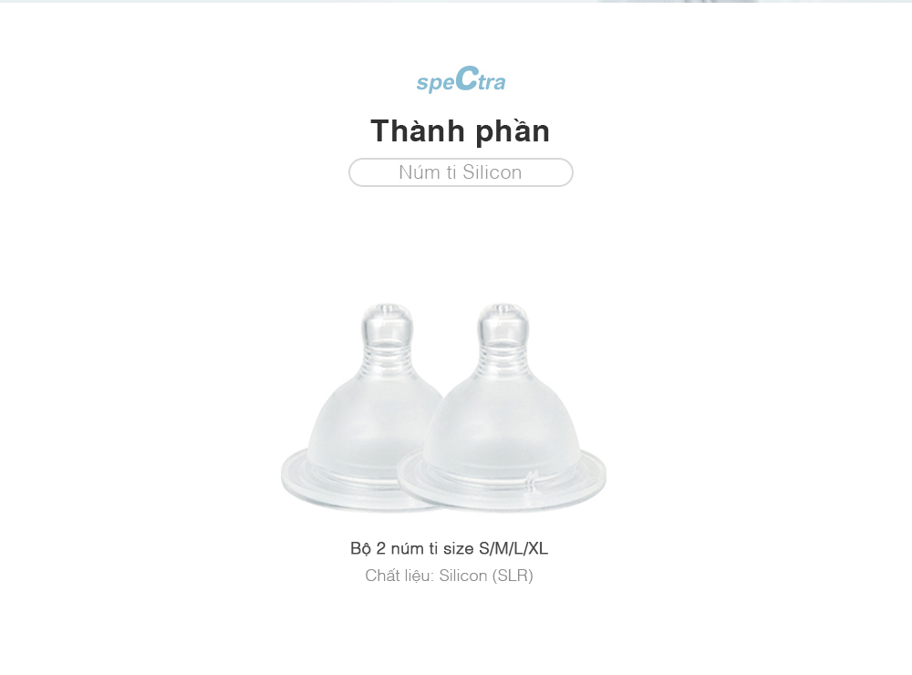 Một bộ bao gồm 2 núm ti với 4 kích cỡ khác nhau tương ứng với từng giai đoạn phát triển của bé. Mẹ có thể lựa chọn núm ti cỡ S cho bé từ 0 - 3 tháng, cỡ M cho bé từ 3 - 5 tháng, cỡ L cho bé từ 5 - 7 tháng và cỡ XL là trên 7 tháng.
