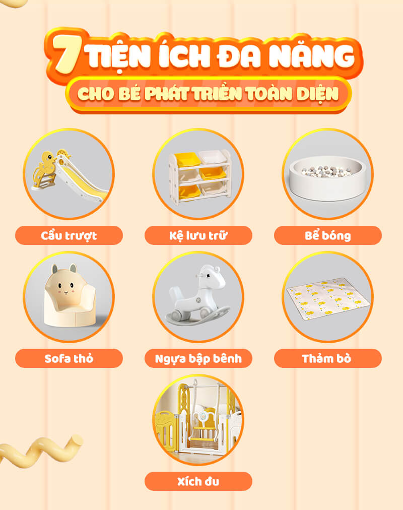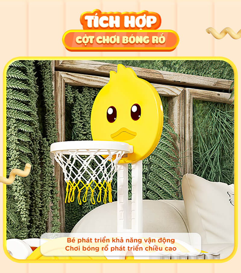 Bộ quây có đa dạng các trò chơi bao gồm cầu trượt, xích đu, bộ bóng rổ tạo điều kiện để trẻ thỏa sức khám phá và phát triển nhiều kỹ năng.