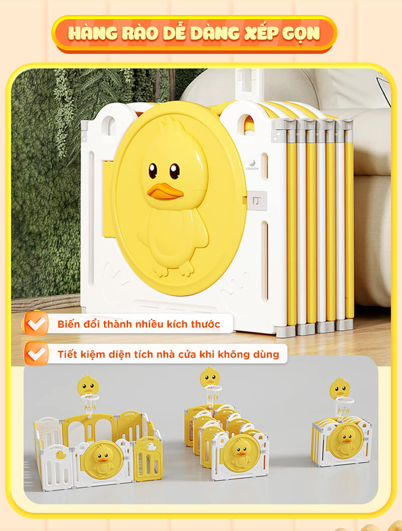 Set quây có chức năng gấp gọn tiện lợi khi không sử dụng, khi cần dùng thì ba mẹ không cần tháo lắp phức tạp. Có thể lắp ráp linh hoạt đa dạng nhiều kiểu dáng sao cho phù hợp với không gian nhà của mỗi gia đình.