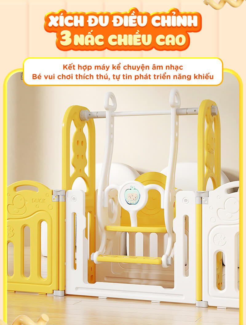 - Xích đu có phát nhạc, đai an toàn và vách ngăn bảo vệ, mang tới sự vui chơi an toàn.