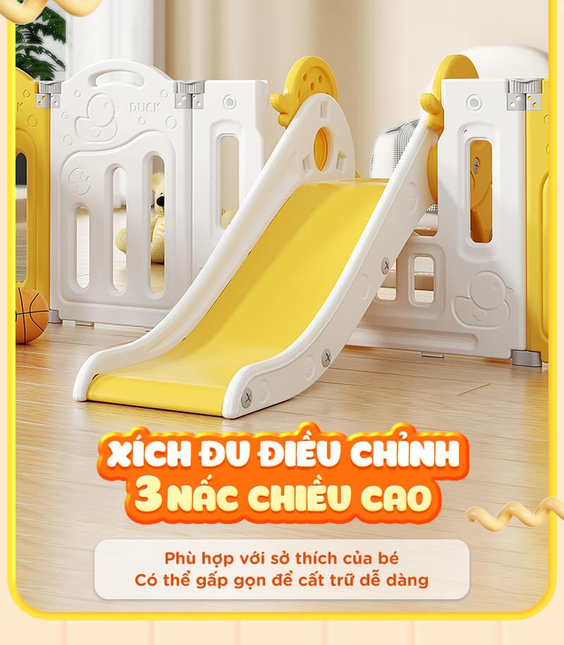 - Cầu trượt gấp gọn và lắp đặt linh hoạt nhiều vị trí, giúp tiết kiệm không gian của set quây.