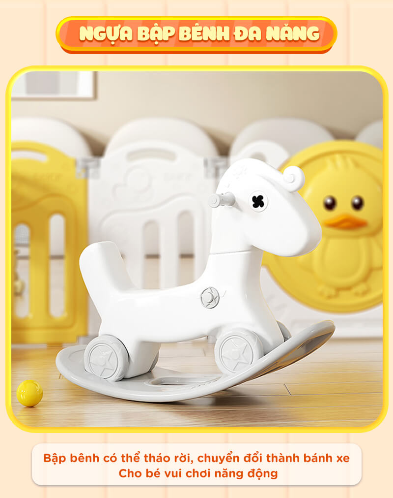 - Ngựa bập bênh có thể linh hoạt tháo rời phần đế trở thành xe đẩy 4 bánh. Bộ đôi trò chơi này giúp bé vận động nhẹ nhàng mà không gây nhàm chán khi chơi trong set quây.