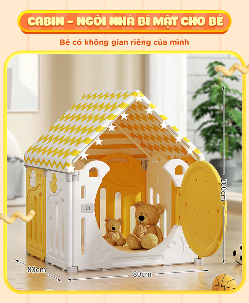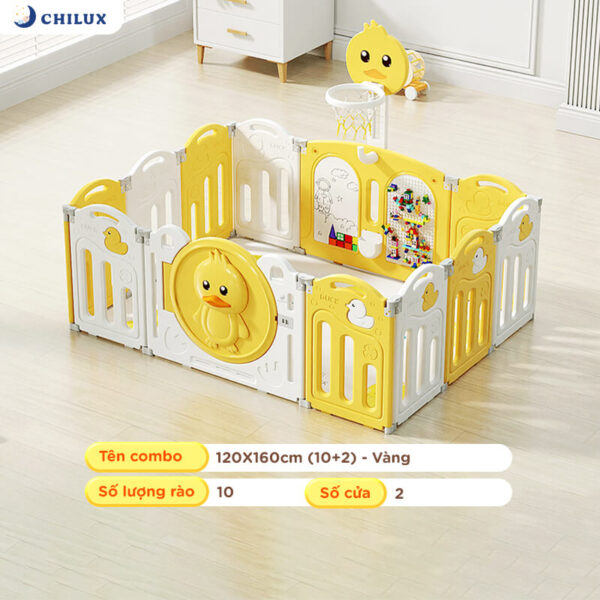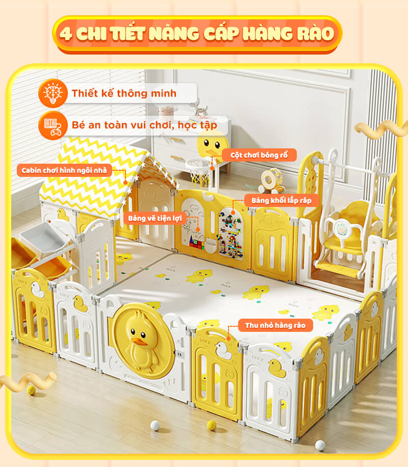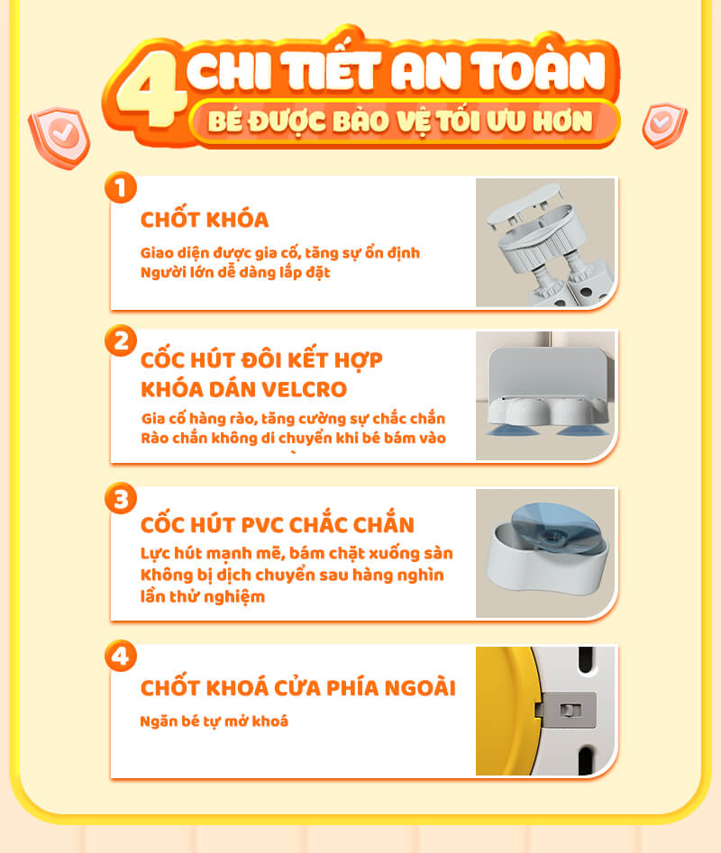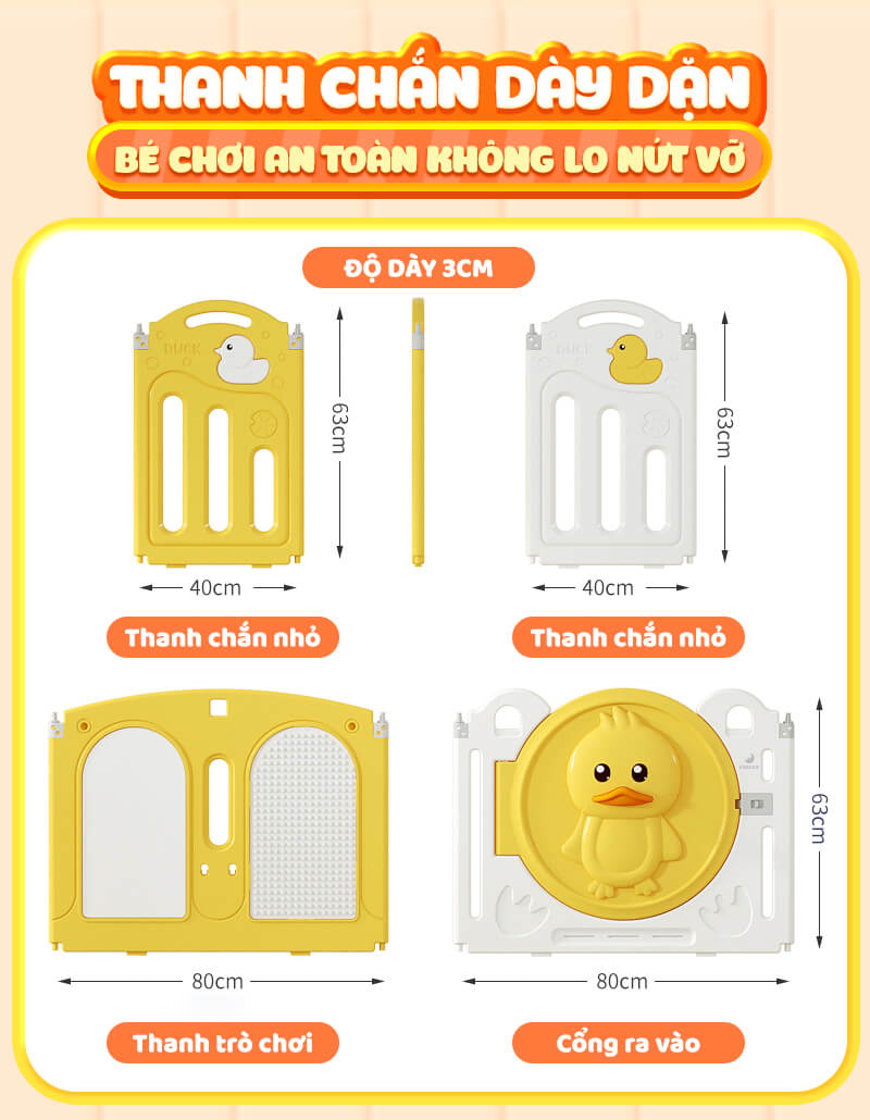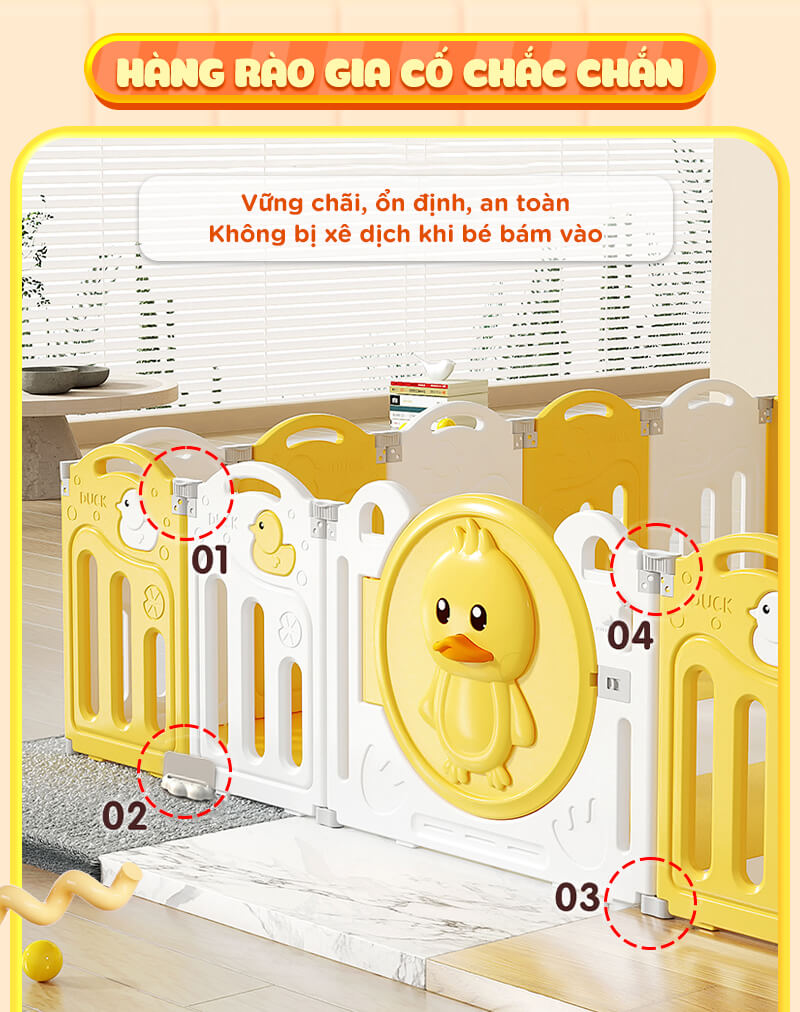 Các chi tiết nhựa được gia cố chắc chắn bằng hệ thống khóa và chốt. Các tấm quây có độ cao hợp lý kết hợp thiết kế chống trèo nhằm ngăn không cho bé leo trèo, đồng thời có cửa khóa chặt. Độ cao lên tới 63cm bảo đảm cho bé chơi đùa hay tập đi một cách an toàn nhất. Tấm quây có thiết kế thanh dọc chống trèo, tấm cửa có khoá ngoài chắc chắn để bé không tự mở cửa.