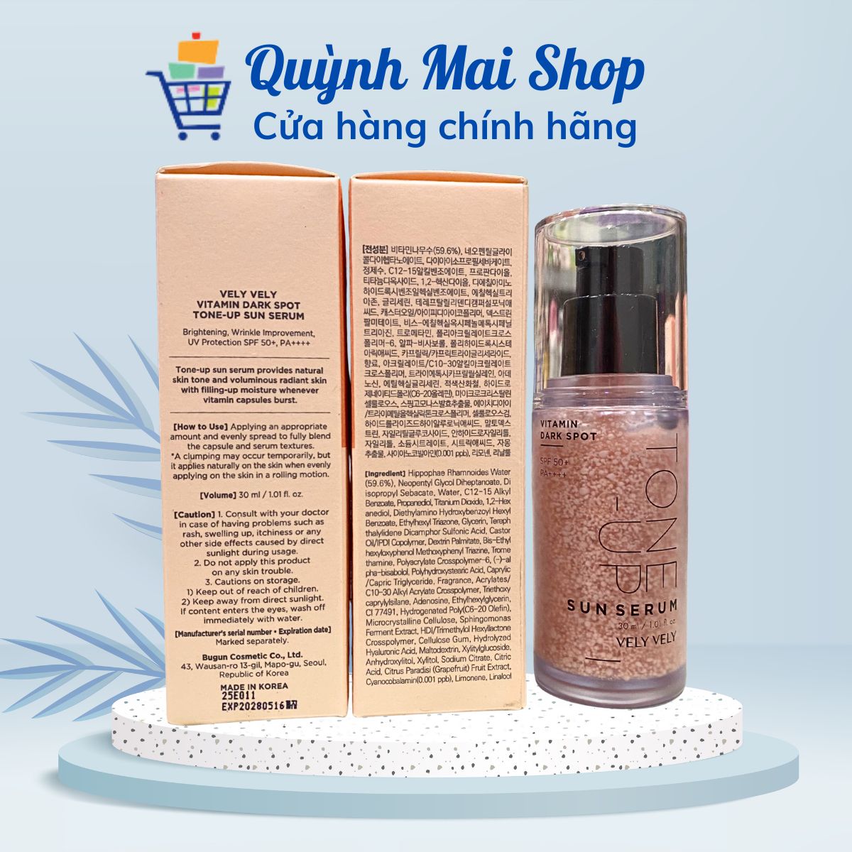 Tinh Chất Serum chống nắng nâng tone Vely Vely Vitamin Dark Spot Tone Up Sun Serum SPF50+ PA++++ là tinh chất chống nắng kết hợp dưỡng da và nâng tone tự nhiên, giúp bảo vệ tối đa trước tác hại của tia UVA, UVB đồng thời cải thiện tông màu da và làm mờ đốm nâu. Công thức chứa phức hợp Vitamin C, Niacinamide và các chiết xuất thiên nhiên giúp chống oxy hóa, ngăn ngừa sạm nám và mang lại làn da rạng rỡ, khỏe mạnh.