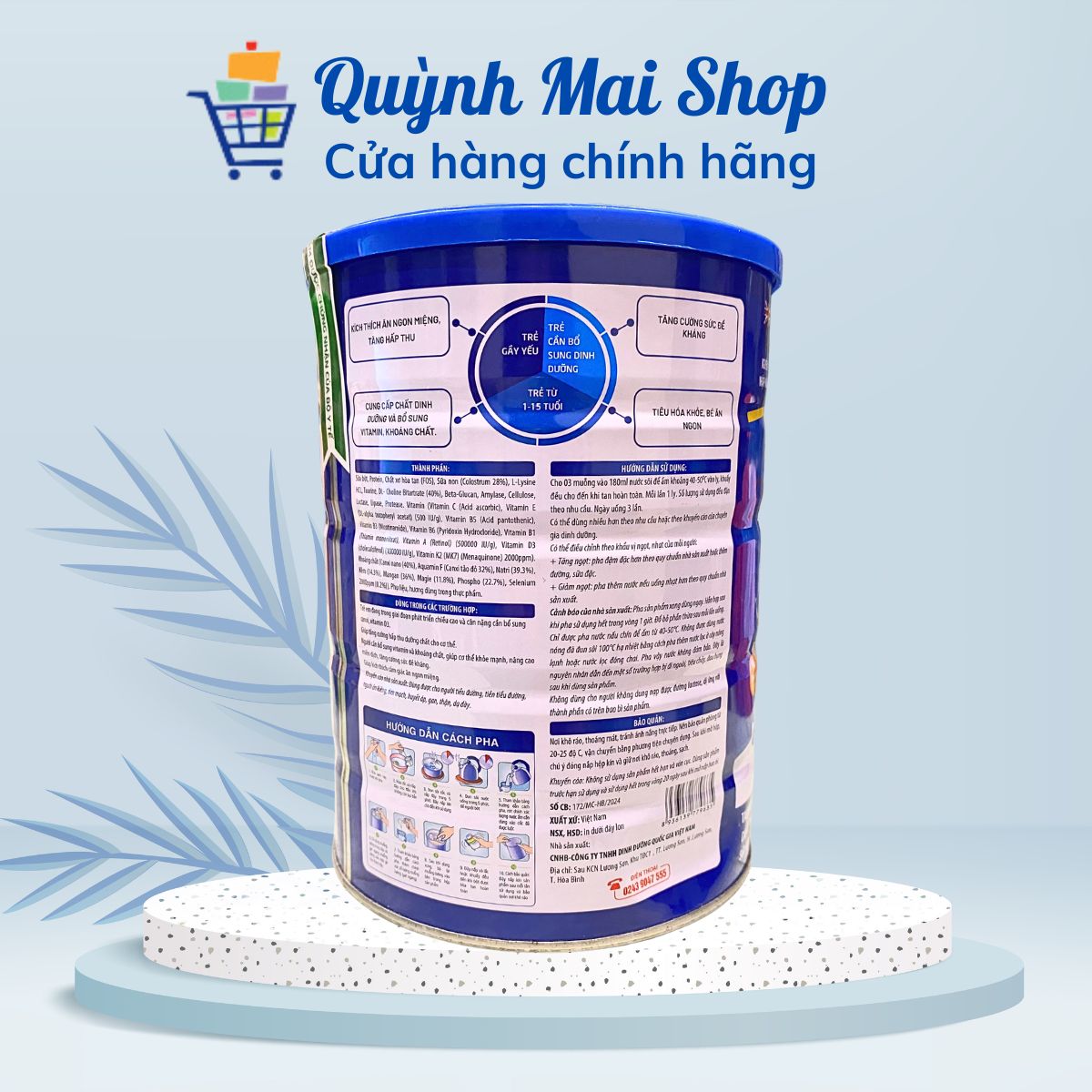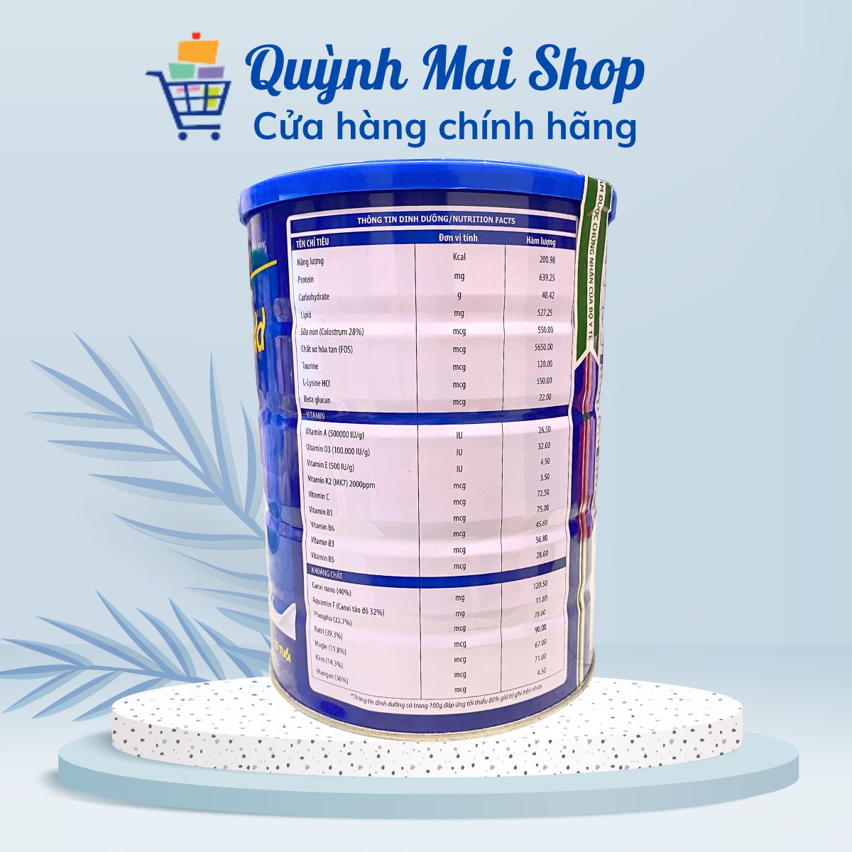 Sữa bột, Protein, Chất xơ hòa tan (FOS), Sữa non (Colostrum 28%), L-Lysine HCL, Taurine, DL-Choline Bitartrate (40%), Beta-Glucan, Amylase, Cellulose, Lactase, Lipase, Protease. Vitamin (Vitamin C (Acid ascorbic), Vitamin E (DL-alpha tocopheryl acetat) (500 IU/g), Vitamin B5 (Acid pantothenic), Vitamin B3 (Nicotinamide), Vitamin B6 (Pyridoxin Hydrocloride), Vitamin B1 (Thiamin mononitrat), Vitamin A (Retinol) (500000 IU/g), Vitamin D3 (cholecalciferol 100000 IU/g), Vitamin K2 (MK7) (Menaquinone) 2000ppm). Khoáng chất (Canxi nano (40%), Aquamin F (Canxi tảo đỏ 32%), Natri (39.3%), Kẽm (14.3%), Mangan (36%), Magie (11.8%), Phospho (22.7%), Selenium 2000ppm (0.2%)). Phụ liệu, hương dùng trong thực phẩm.