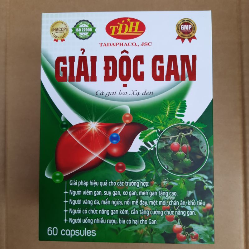 Viên uống giải độc gan Cà gai leo - Xạ đen - Lọ 60 viên - Bổ gan, giúp tăng cường chức năng gan, thanh nhiệt, giải độc rượu bia 1. Thành phần - Cà gai leo ............................... 5000 mg - An xoa .................................... 600mg - Xạ đen......................................1000 mg - Actiso ...................................... 800mg - Giảo cổ lam..............................600 mg - Mật nhân ................................ 600mg - Diệp hạ châu............................600 mg - Methionine............................... 20 mg - Vitamin PP (Nicotinamid)........ 2 mg - Vitamin B1 (Thiamin HCL)..... 2 mg - Vitamin B6 (Pyridoxine).......... 2 mg - Vitamin C ................................ 2 mg Phụ liệu : Talc, lactose, Cavamax w6 (alpha cylodextrin) 100mg vừa đủ 1 viên. 2. Công dụng: - Giúp thanh nhiệt, hỗ trợ giải độc gan và bảo vệ gan - Hỗ trợ giúp tăng cường chức năng gan, bổ gan. - Tăng cường chức năng đào thải độc tố cho gan, hạn chế tổn thương các tế bào gan. - Hỗ trợ điều trị: viêm gan, gan nhiễm mỡ, men gan tăng cao, xơ gan. - Làm giảm các triệu chứng nóng trong, mụn nhọt, dị ứng, mẩn ngứa, vàng da do chức năng gan bị suy giảm. 3. Đối tượng sử dụng - Người bị viêm gan, suy gan, xơ gan, men gan cao. - Người bị vàng da, mẩn ngứa, nổi mề đay, mệt mỏi, chán ăn, khó tiêu do chức năng gan kém. - Người uống nhiều rượu có hại cho gan 4. Cách dùng - Uống 1 viên/ lần/ ngày - Trường hợp nặng uống uống 1 viên/ lần x 2 lần/ ngày Lưu ý: - Không dùng cho người mẫn cảm với bất kì thành phần nào của sản phẩm. - Thực phẩm này không phải là thuốc, không có tác dụng thay thế thuốc chữa bệnh. 5. Bảo quản: Nơi khô ráo, thoáng mát, tránh ánh nắng trực tiếp. Quy cách đóng gói: Lọ 60 viên Hạn sử dụng: 36 tháng.
